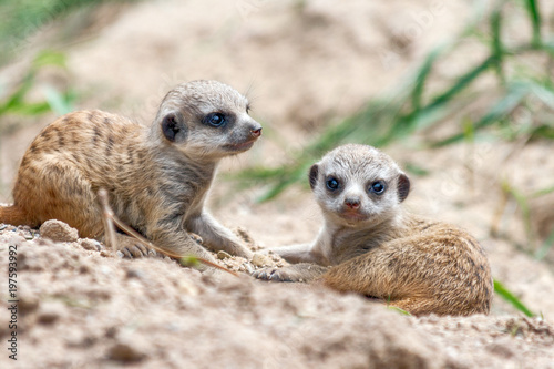 Fototapeta premium Young suricates playing in the sand.