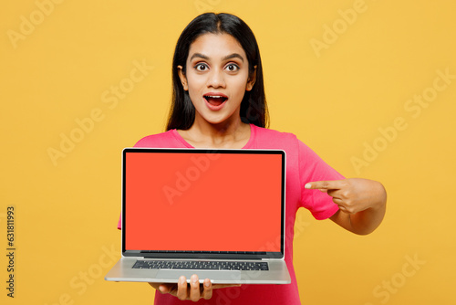© ViDi Studio, Naklejka premium Young surprised IT Indian woman wearing pink t-shirt casual clothes hold use work point on laptop pc computer with blank screen workspace area isolated on plain yellow background. Lifestyle concept.