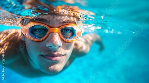 Fototapeta premium Young swimmer underwater wearing goggles. Perfect for aquatic sports,...