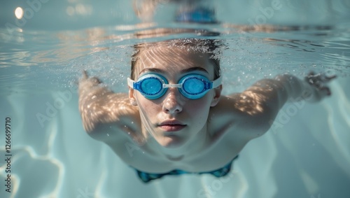 Fototapeta premium Young Swimmer with Blue Goggles Diving into Refreshing Pool Water