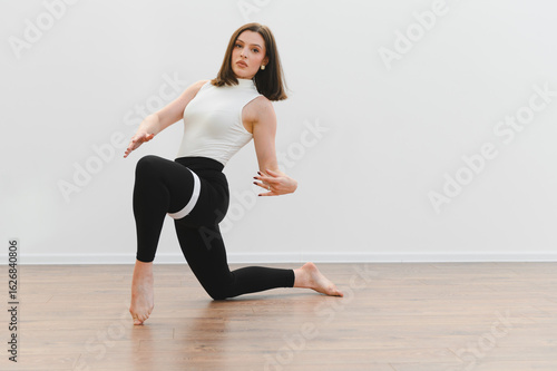 Obraz premium Young talented dancer performing modern choreography in dance studio