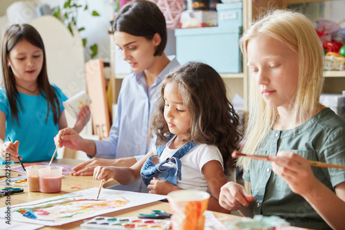 © Comeback Images, Fototapeta premium Young teacher and sweet schoolgirls sitting at desk in art school and painting bright pictures together