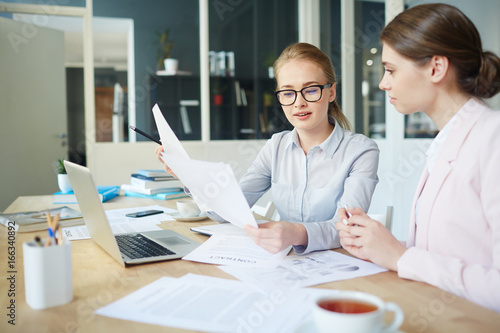 Obraz premium Young teachers discussing paperwork of their students while checking them