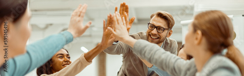 Fototapeta premium Young team putting hands up for new startup in the office
