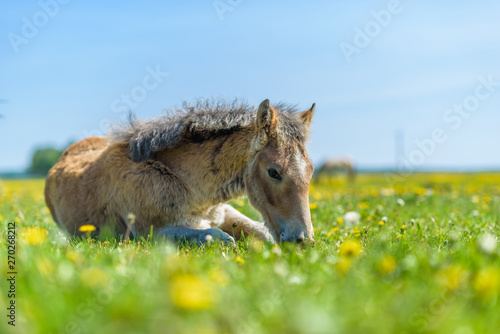 © shymar27, Fototapeta premium Young thoroughbred foal resting in a meadow.