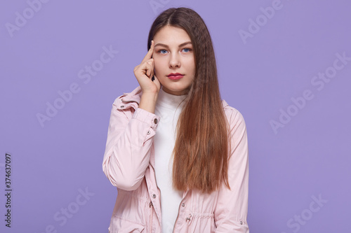 © sementsova321, Fototapeta premium Young thoughtful female has serious pensive expression, keeping finger near temple, wearing pale pink jacket, stands against lilac background, looks at camera.