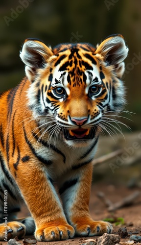 © Michael, Fototapeta premium Young tiger explores its natural habitat in the forest during daylight hours