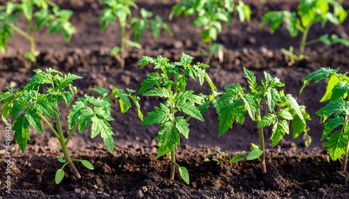 © jakiyo, Obraz premium Young tomato plants growing in rows.