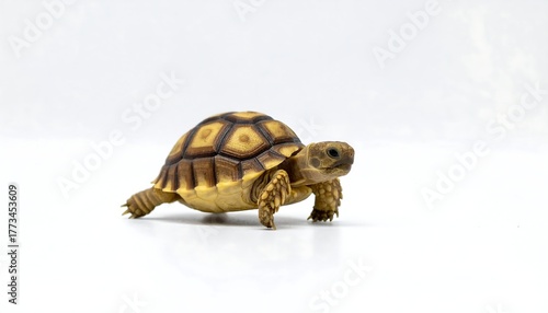 © alfin, Fototapeta premium Young tortoise walking on a white surface