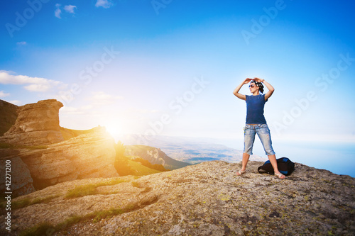 © Dmytro Titov, Naklejka premium young tourist looks for way from the rocks top