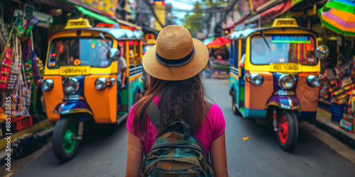 © Andres Mejia, Fototapeta premium Young tourist woman choosing a tuk tuk taxi in the streets of bangkok