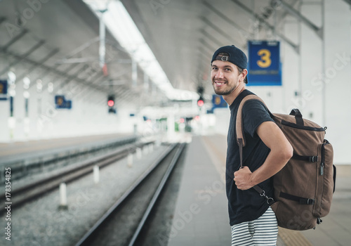 © Irina, Fototapeta premium Young traveler walking with backpack on train station