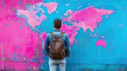 © weerasak, Obraz premium Young traveler with a backpack viewing a colorful map of the world on a vibrant wall, contemplating future adventures.