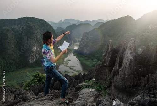 © Wuttichai, Obraz premium young travelers point to travel through a map in hand. On a scenic hilltop along the way. at Hang Mua, Ninh Bình in Vietnam.