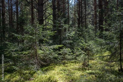 © olgavisavi, Obraz premium young tree in a dense spruce forest. sunny summer day