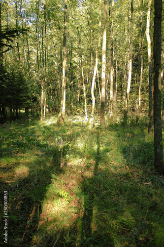 Obraz premium Young tree in sun rays in forest