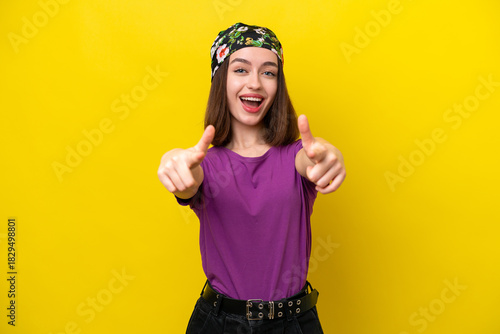 Fototapeta premium Young Ukrainian woman isolated on yellow background surprised and pointing front