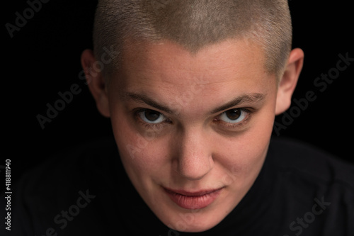 Obraz premium Young urban with short blonde hair poses before a black backdrop.