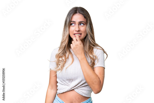 © luismolinero, Fototapeta premium Young Uruguayan woman over isolated background nervous and scared
