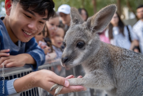 © YouraPechkin, Fototapeta premium Young visitor interacts with a kangaroo at the wildlife exhibit in the afternoon