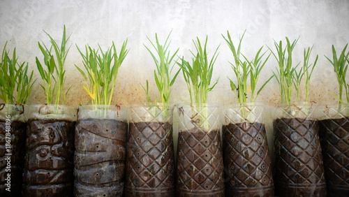 Obraz premium Young Water spinach plants growing in recycled plastic bottles