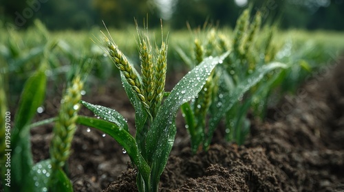 © CreativeSuburb, Obraz premium Young wheat plants growing in fertile soil with morning dew