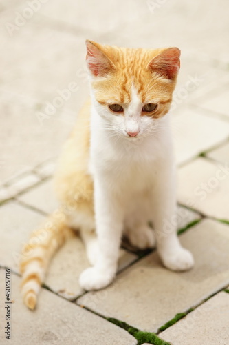 © Omega, Obraz premium Young white ginger kitten sitting on the street in summer day