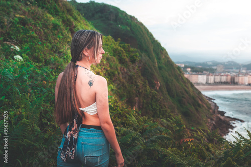 © Jorge Argazkiak, Naklejka premium Young white girl with white shirt and jeans in the mountain.