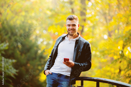 Obraz premium Young white guy using a mobile phone in a park with yellow trees on background. Autumn season time