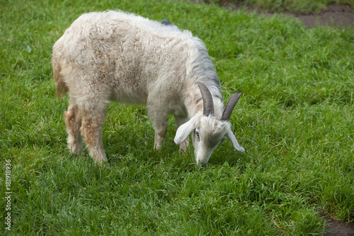© tadoma, Obraz premium young white homemade goat (Capra hircus) eats green grass