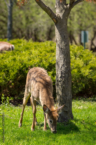 © CAG Photography, Naklejka premium Young whitetail deer standing next to a tree grazing on dandelions in an urban park.