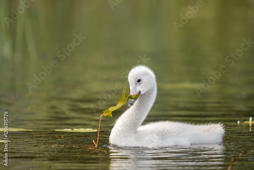 Fototapeta premium Young whooper swan cygnet gently swims in calm waters, curiously foraging for...