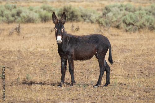 Naklejka premium Young wild burro (Equus asinus) standing alert in the dry sagebrush plains of Smoke Creek Desert, Lassen County, California.