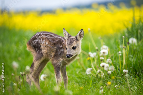 Naklejka premium Young wild roe deer in grass, Capreolus capreolus. New born roe deer, wild spring nature.