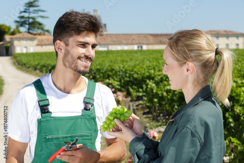 © auremar, Fototapeta premium young wine producers holding bunch of freshly picked grapes