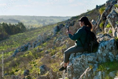 © Alejandro Piorun, Obraz premium young woman above the mountains in the middle of nature taking photos of the landscape and likewise with a sunny day.