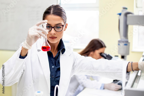 © pucko_ns, Fototapeta premium Young woman analyze while second looking at microscope in background