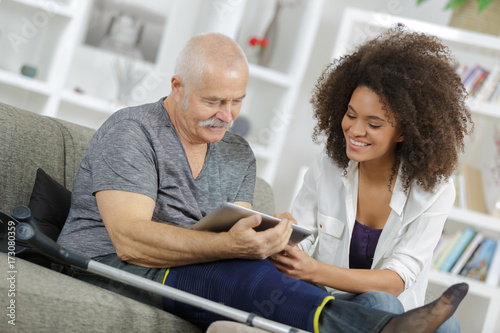 © auremar, Obraz premium young woman and senior man chating with family using tablet