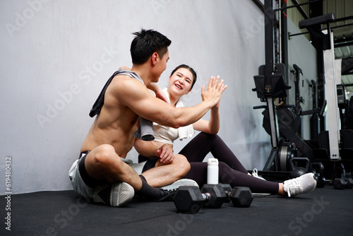 © krongthip, Obraz premium Young woman and young man exercising in the gym fitness concept.
