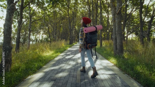 © Azhorov, Fototapeta premium Young woman appears content while walking along paved path in serene park. Carrying yoga mat and backpack, she enjoys nature.