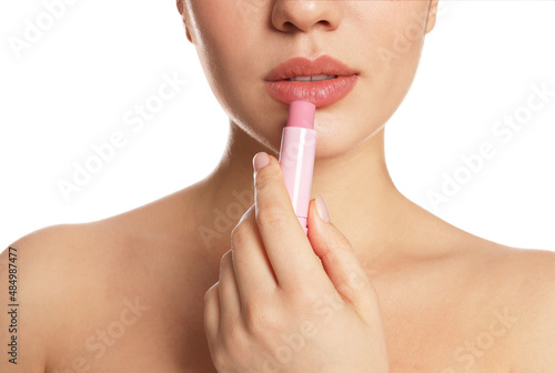 © New Africa, Obraz premium Young woman applying lip balm on white background, closeup