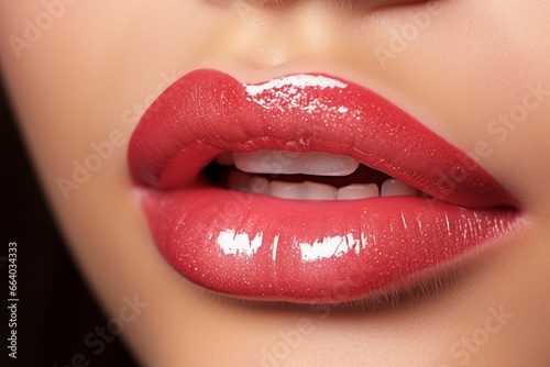 Obraz premium Young woman applying lip gloss very closeup, woman glossy lip closeup, glossy lip, red glossy lip, woman lip, beautiful woman lip, woman lip makeup