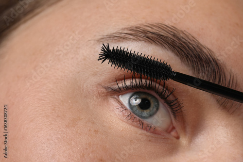 Obraz premium Young woman applying mascara onto her eyelashes, closeup