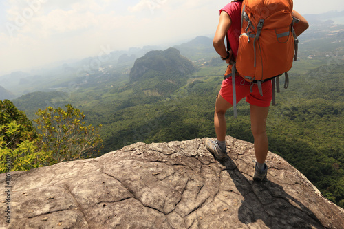 Obraz premium young woman backpacker hiking on mountain peak cliff