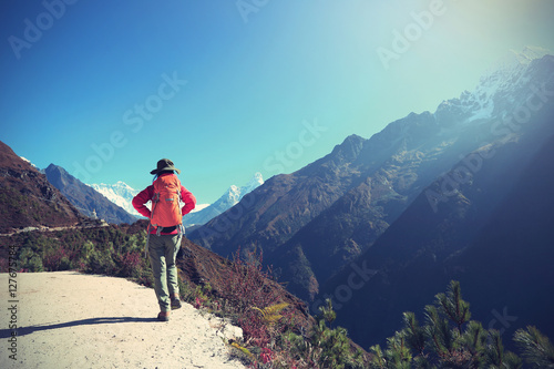Obraz premium young woman backpacker trekking on himalaya mountains