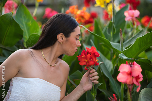 © Manuel, Fototapeta premium Young woman, beautiful, brunette, blue eyes, Hispanic, wearing a white top, surrounded by plants, smelling the scent of beautiful colorful flowers. Concept: model, beauty, fashion, trendy.