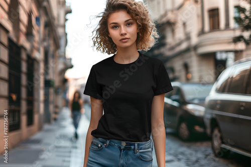 Fototapeta premium Young Woman Black T-Shirt Mockup, The Essential Wardrobe Staple: A Versatile...