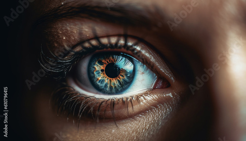 Obraz premium Young woman blue eyes staring sensually at camera, indoors generated by AI