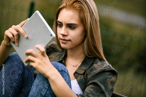 © Giulio_Fornasar, Obraz premium Young woman browsing on tablet outdoors in thought