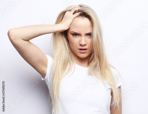 Fototapeta premium Young woman clutching her head with her palms while suffering from a migraine.